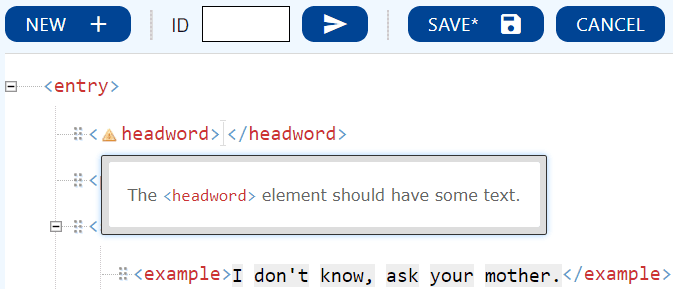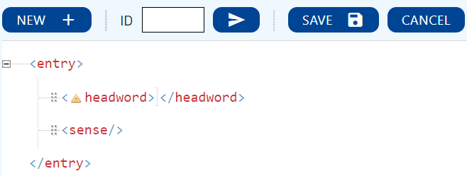 To create an entry, you will need to add a headword to the XML structure (that is, to add a word between the opening and the closing tag) and then click on Save. If you work with one of the templates of Lexonomy, an entry minimally requires a headword and one sense (this can even be empty). Deleting any of these from the structure will cause errors.
