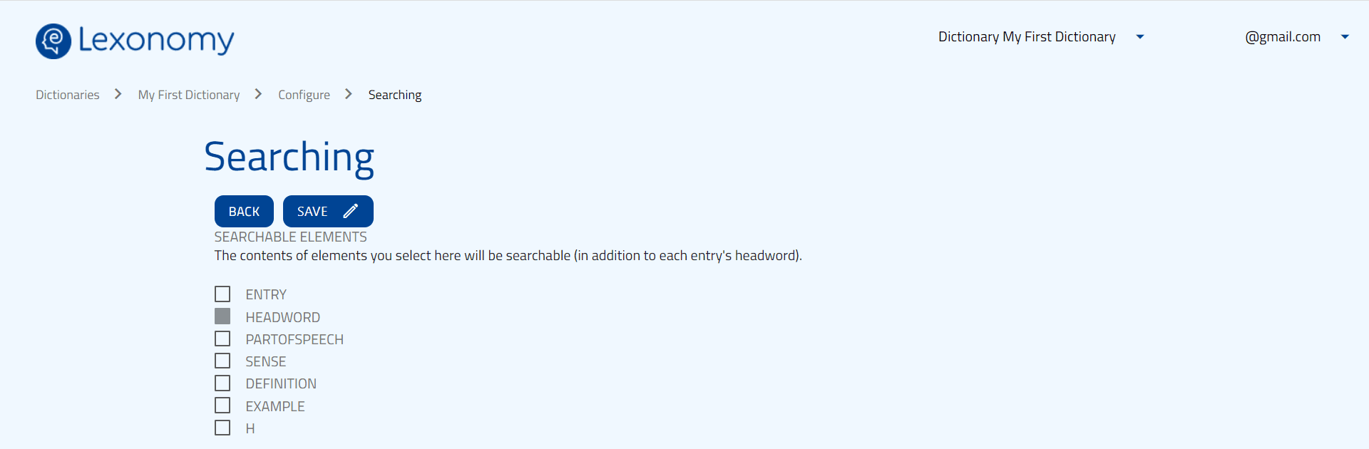 On the other hand, feel free to play around with these settings as much as you want if you have an empty dictionary: you can rename elements, change the hierarchy of elements, specify searchable elements, and so on, to make Lexonomy a better fit for your purposes. Now let’s move on to exploring these!
